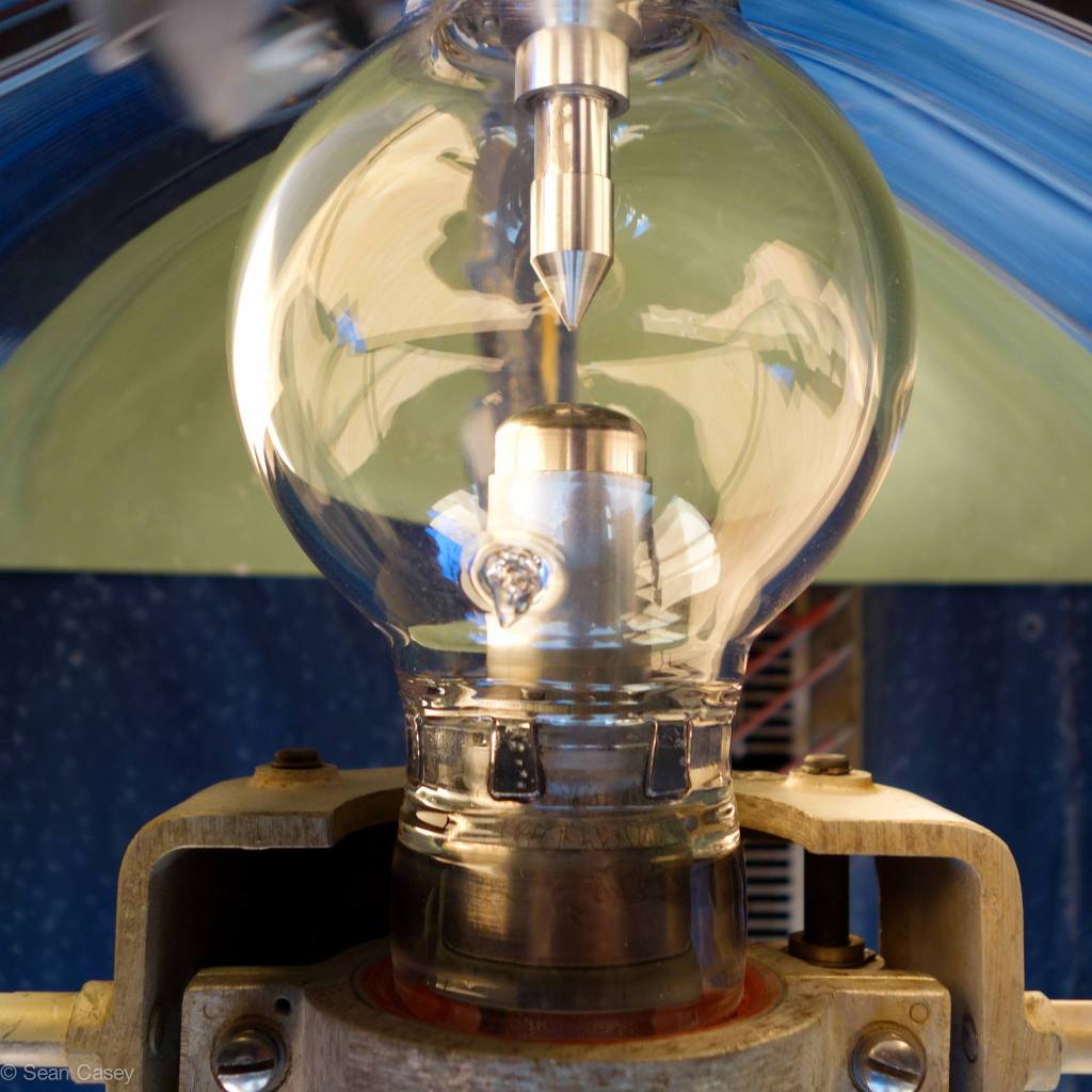 The anode (round end) is a hollow tungsten cup, with coolant pumped into a tube aimed at the back of it, then circulated to the cathode (pointy bit). The 2hp pump circulates 6 gallons/minute at 150psi through a ¼” tube.